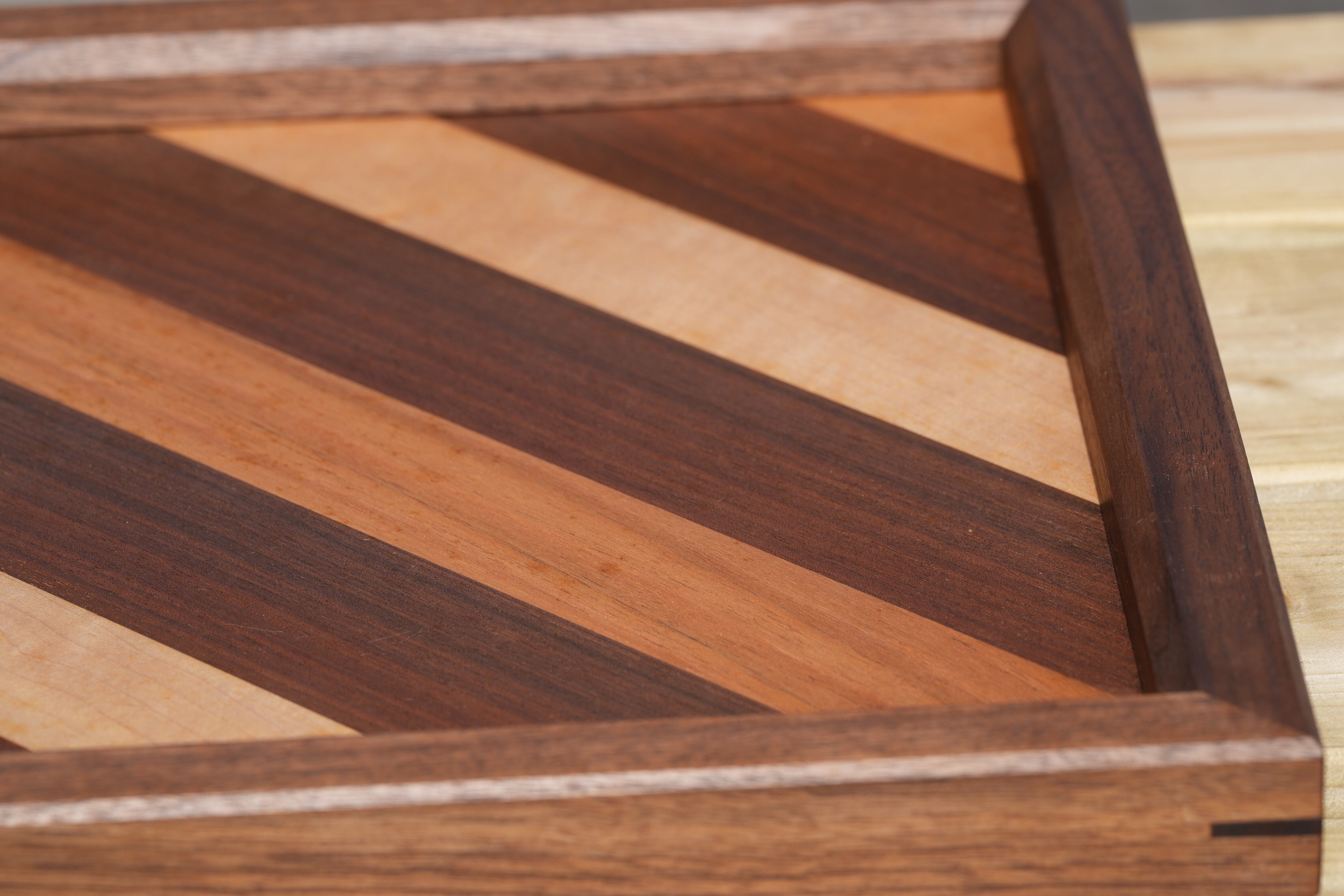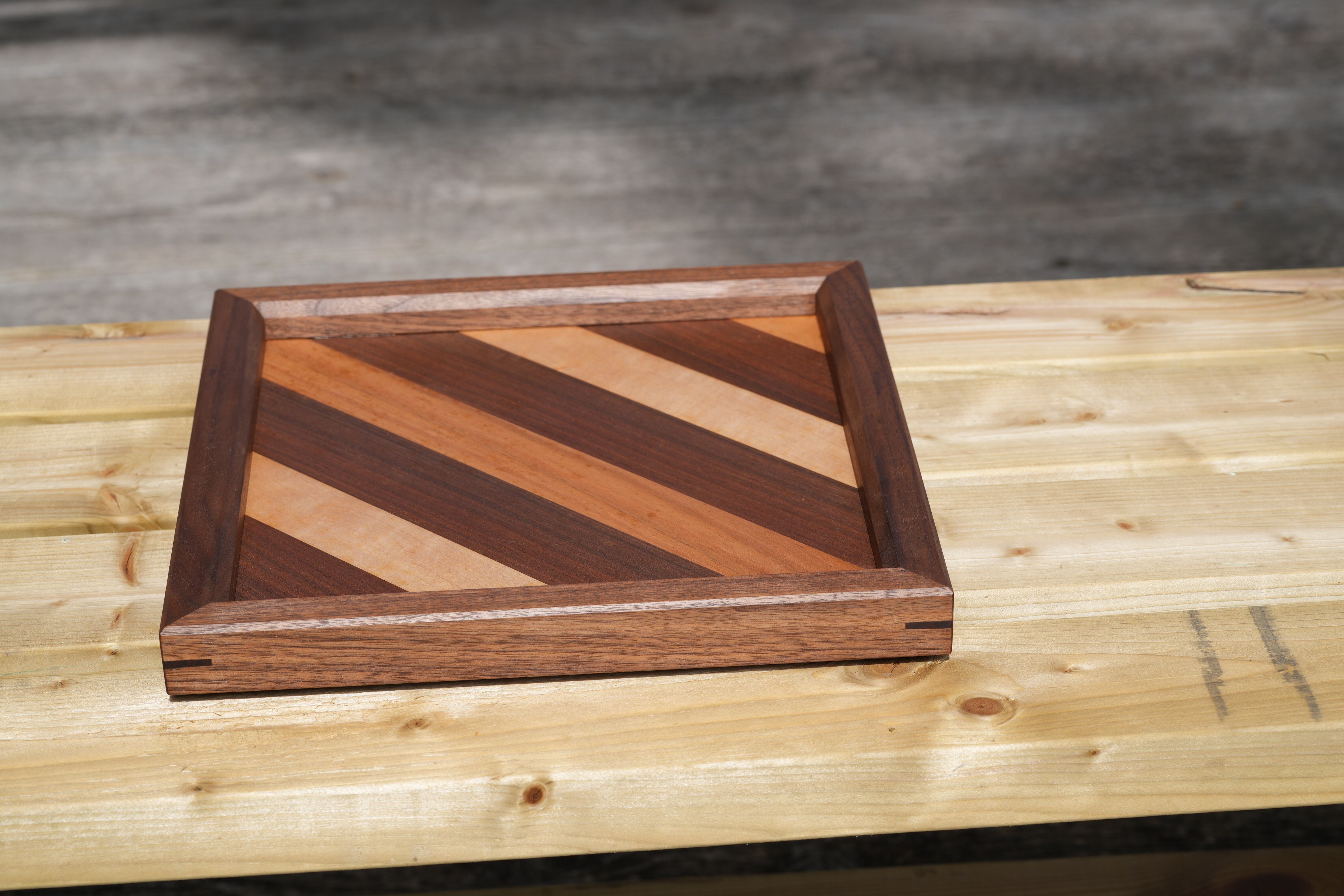 素材:ウォールナット・カエデ サイズ:30×30 オイル仕上げ 木の組み方がおしゃれなトレイです